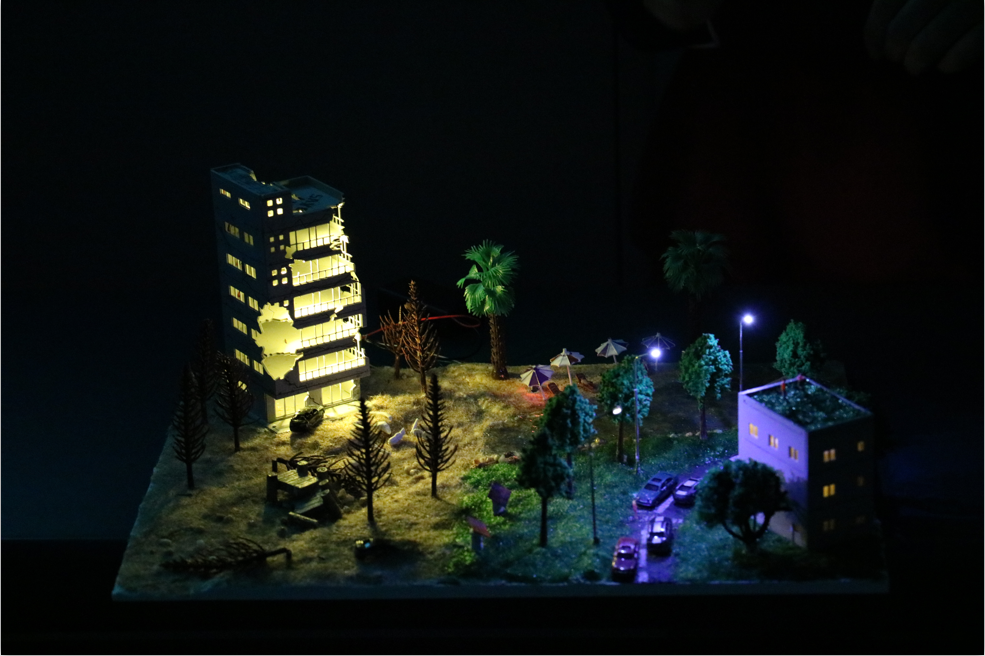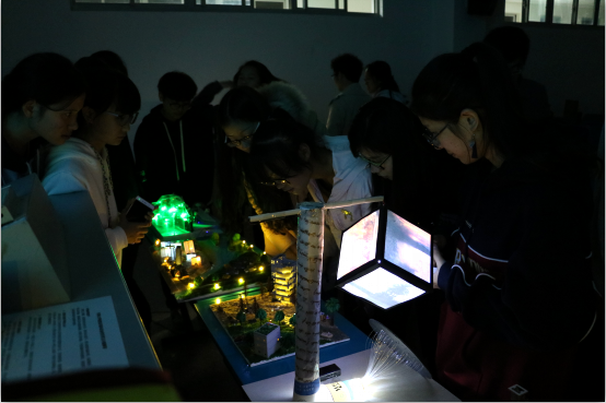 经过两周的努力,来自各学院的16个小组带着自己引以为豪的作品来到了比赛场地。通过ppt讲解,参赛选手们将自己的作品展示给大家。参赛的每个作品都十分精致,其中内涵也发人深思;而关上灯后,各种绚烂的灯光更是令人惊叹。其中“海绵城市生态造景”使用天然植物,创新地将园艺造景与单片机编程综合应用在沙盘模拟中;“4034”通过强烈对比,借未来之景来警示人们保护环境,其制作之精致让人叹为观止;而“孤岛之声”则是构建了一幅安逸美好的画面,黑暗中的灯光也美轮美奂。这三个作品给评委和观众们留下了深刻的印象。