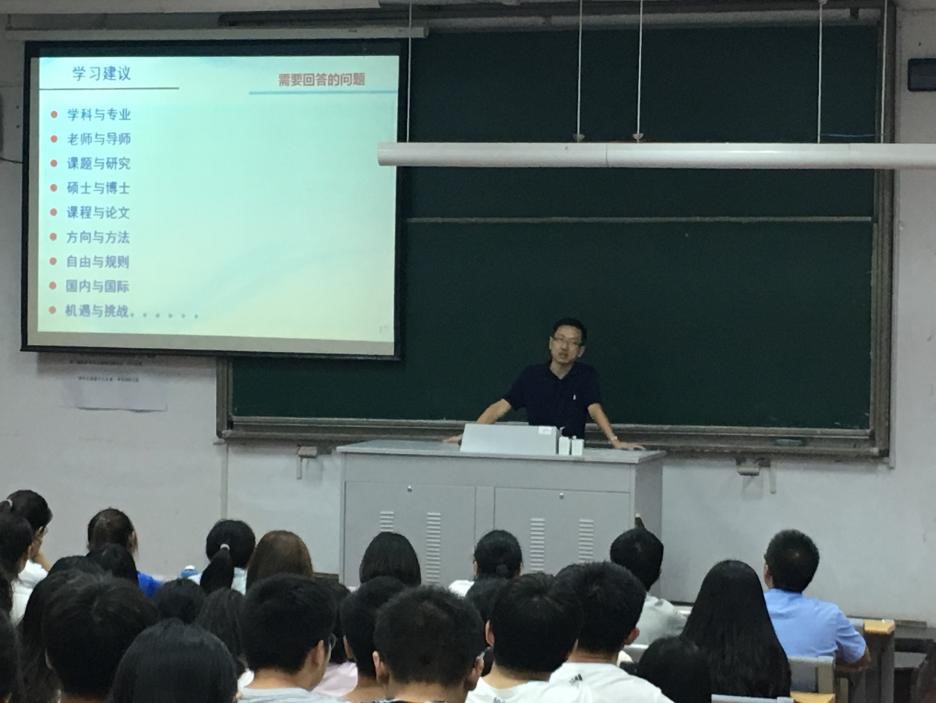 李轶老师首先从老王论坛简介 、特色优势、学习建议三个方面进行了讲话,为同学们详细介绍了学院的专业优势、师资结构和人才培养平台,也对同学们在研究方向、学习方式、文献阅读等方面提出了建议,鼓励同学们目光放长远,多参与学术交流。