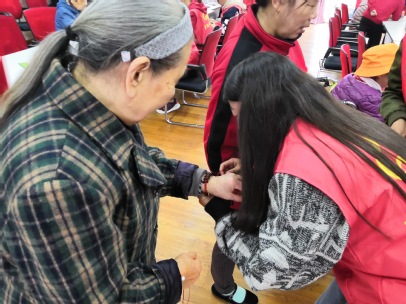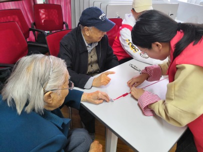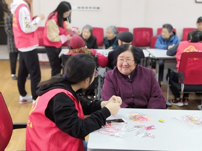 待老人全部入座,志愿者们也分别坐在了老人旁边,一边与老人交谈,一边编织手链。在编织手链的过程中,志愿者们聚精会神地听着老人们讲述以前的故事,不断向老人们询问故事细节,老人们的情绪也更加高涨,纷纷露出了怀念的笑容。