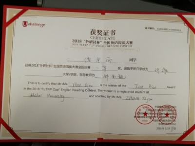 此项大赛由外语教学与研究出版社,教育部高等学校大学外语教学指导委员会等组织联合举办,历时3个月,由网络赛、学校落地赛、省内复赛和全国决赛组成。侯思雨同学于学校落地赛中脱颖而出,以校级特等奖晋级省赛,又力压省内其他高校选手以江苏省第一名的成绩顺利晋级全国决赛,最终在全国赛中取得一等奖的好成绩。