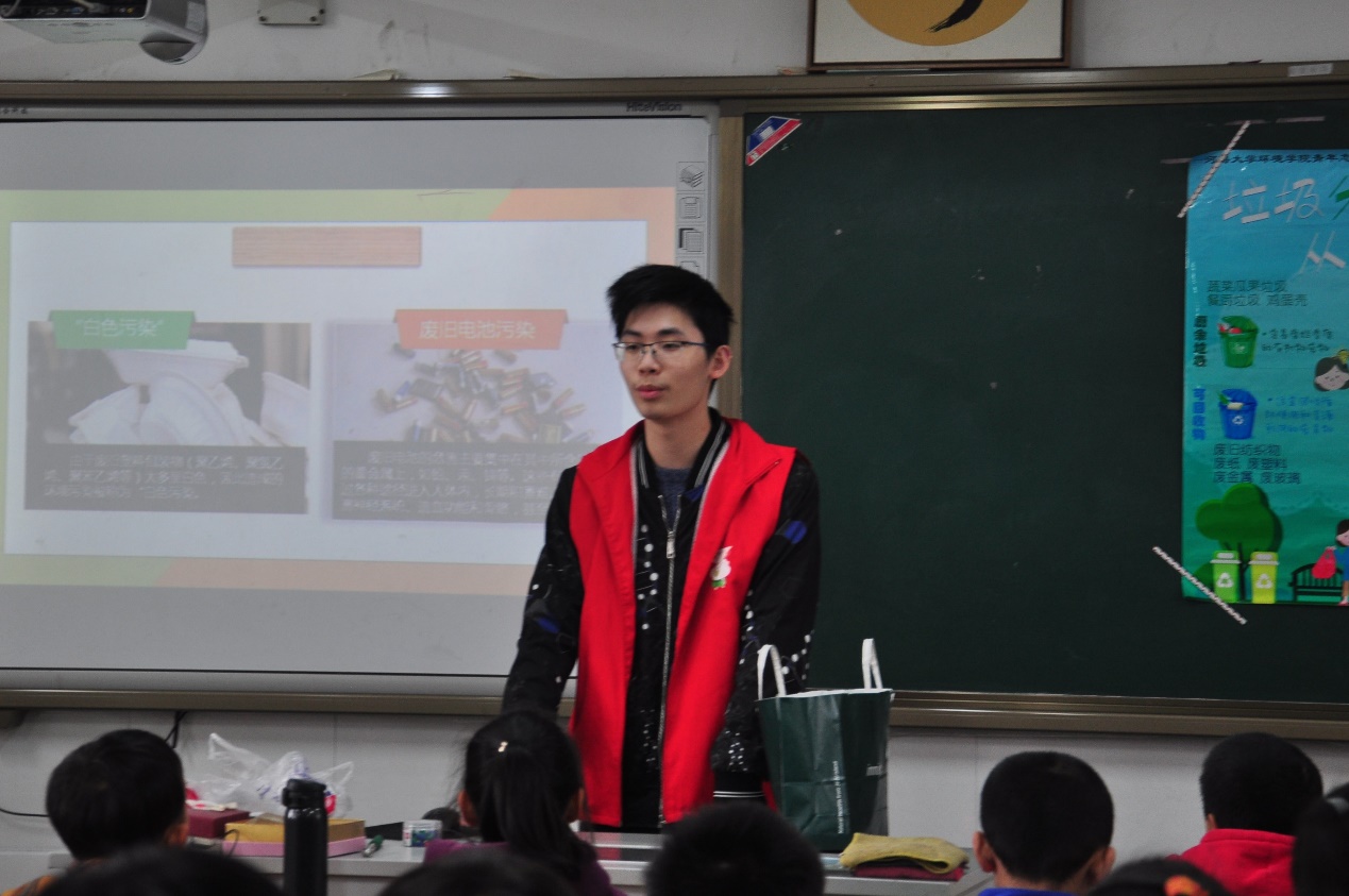 志愿者们分成了四组,一组中,一人负责讲解垃圾分类相关知识,其余三人协助讲师开展活动、维持秩序。在负责人简短交代了注意事项后,志愿者们进入了自己负责的班级。