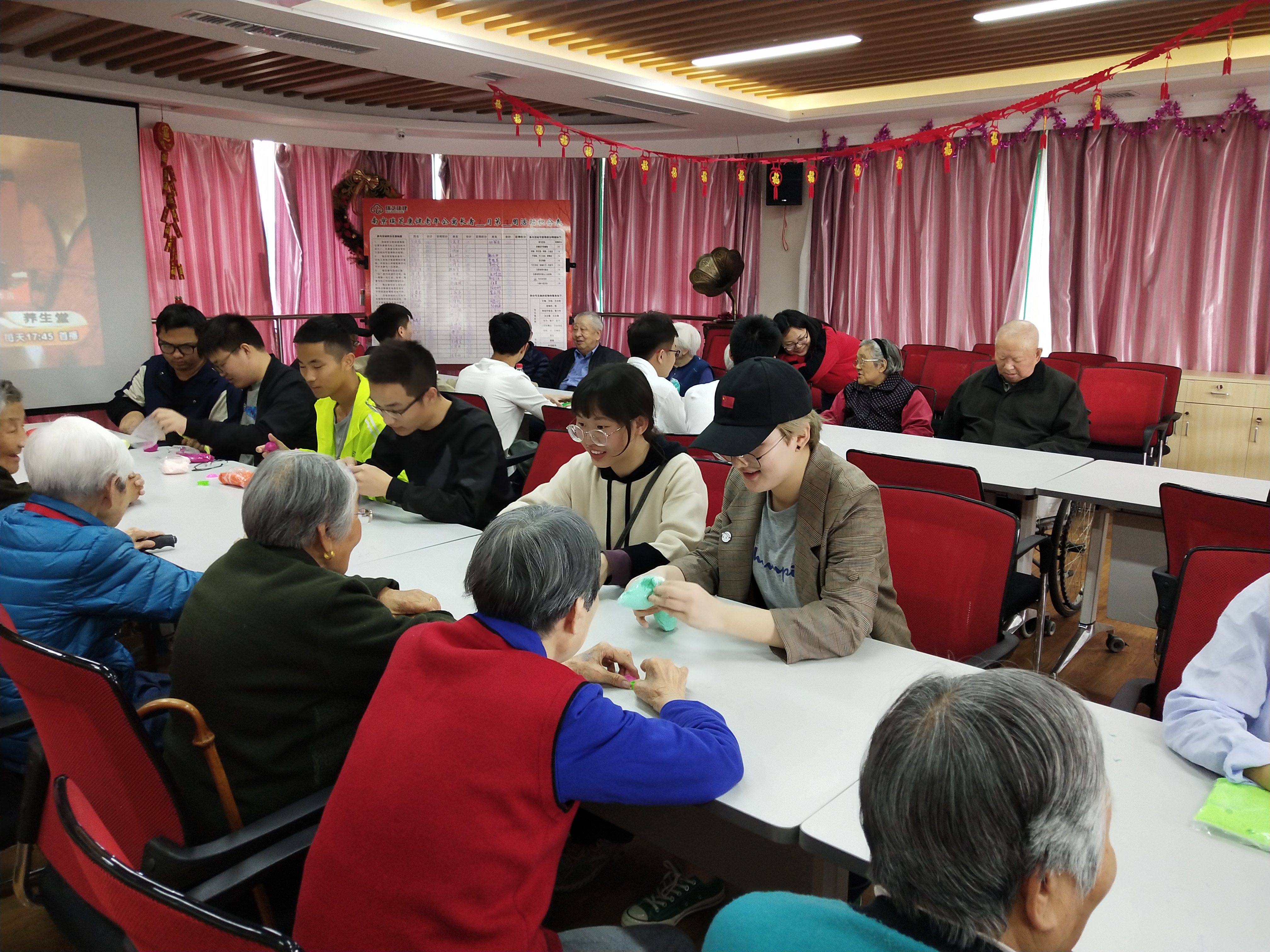 下午2点整,志愿者们在东门集结完毕,便乘车前往敬老院。志愿者们到达养老院后,便来到了坐满老人的会客厅。老人们显然都对这次活动充满期待。志愿者们将椅子搬运到长桌旁,坐下与老人们进行交流。
