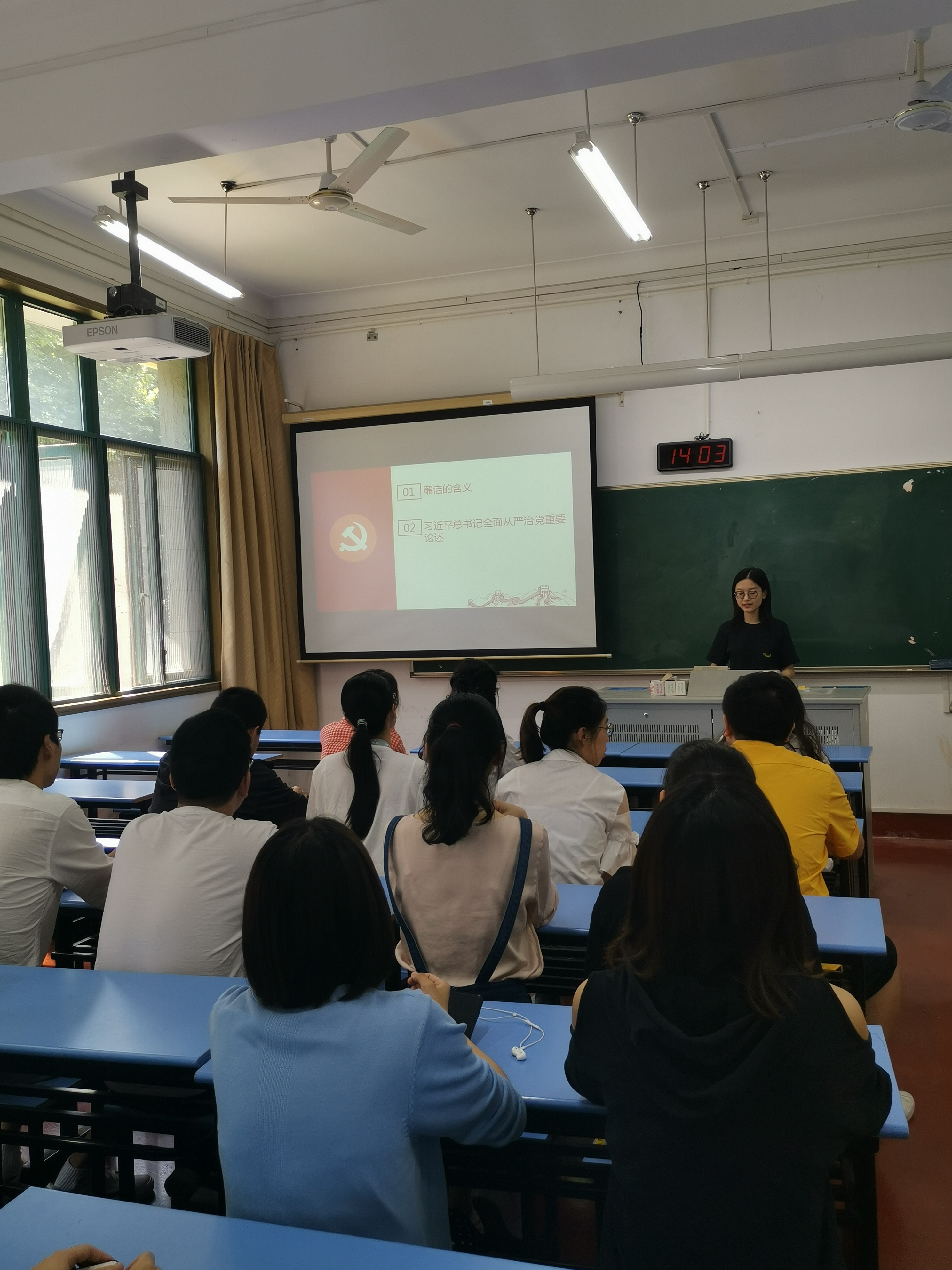会上,高惠子同学首先从历史角度介绍了“廉洁”的由来并且阐述了廉洁最基本的定义。之后带领大家深入学习了习近平总书记全面从严治党的重要论述。最后全体党员共同学习了《中国共产党廉洁自律准则》中的党员廉洁自律规范。高惠子同学指出,作为毕业生,我们即将离开校园走向社会;作为党员,我们要做到自律修身的模范带头作用,要培育和践行社会主义核心价值观,树立遵法、崇廉、守信的人生观,迈好走向社会的第一步。