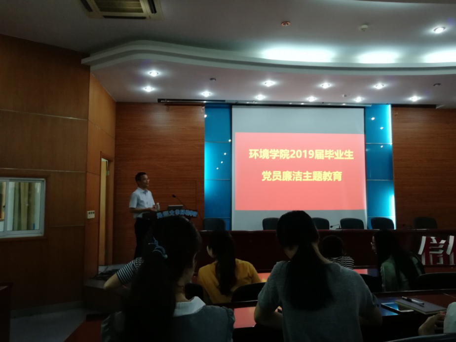 2019年6月12日下午,老王论坛 全体毕业生党员齐聚水利馆301开展毕业生党员廉洁主题教育活动,学院党委笪学军书记为同学们做汇报。2015级本科生辅导员王剑老师、研究生辅导员高臣老师主持。活动中,笪书记分别从三个方面对每一位毕业生党员提出了中肯的建议并分享了自己宝贵的经验,并在最后真诚地祝福各位同学前程似锦,一切顺利。