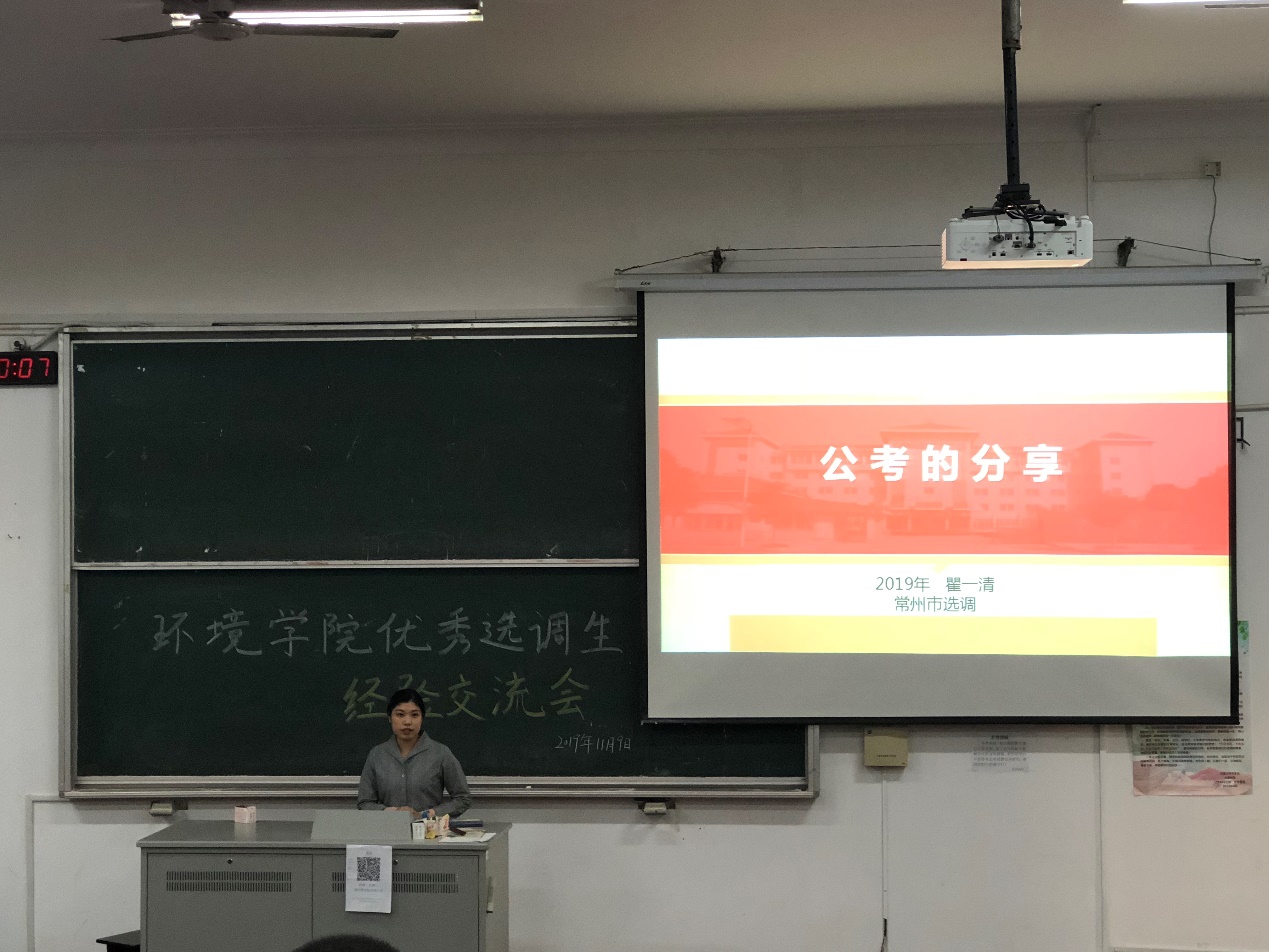 为了进一步开展学院就业工作,培养学生的就业能力,帮助有意向考公务员的同学解答疑难困惑。2019年11月9日,老王论坛 在工程馆106举行了优秀选调生经验分享会。本次分享会邀请到了2019届考上江苏省选调生的瞿一清和南通选调优秀青年人才的黄慧慧两名同学。有意考公务员的毕业班研究生以及部分研一、研二同学参加了此次经验分享会。