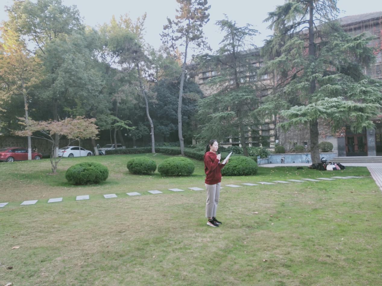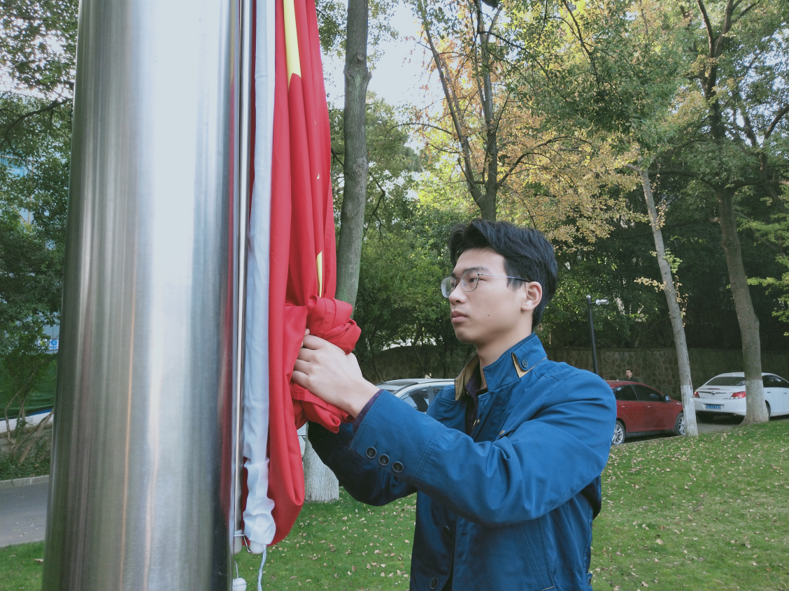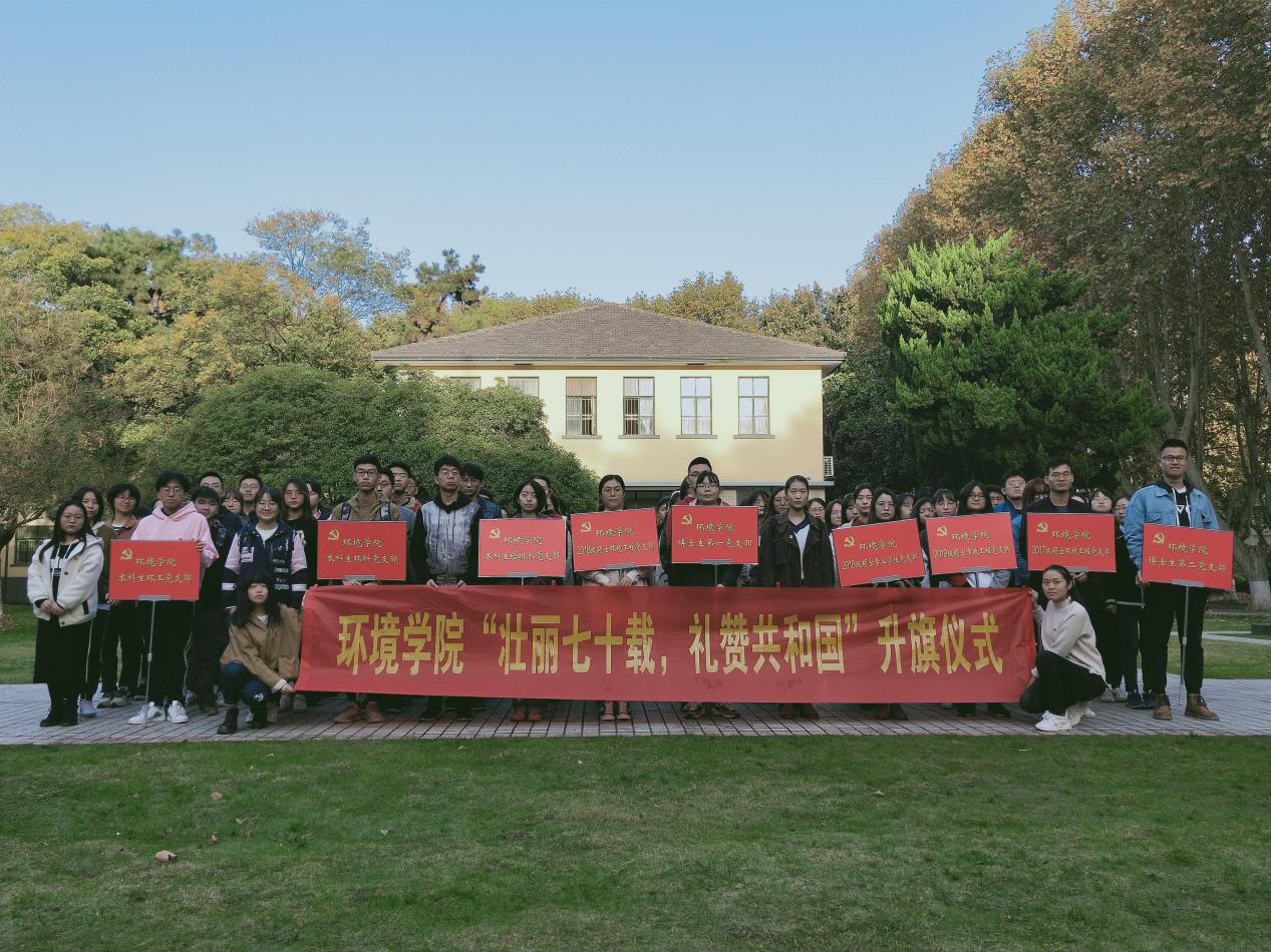 仪式第一项,升国旗,奏唱国歌,全体师生面向国旗行注目礼。此次升旗由本科生给排水党支部李雨笑和王澳两位同学担任升旗手。清晨的第一缕阳光投向五星红旗,晚秋的寒冷也扑不灭环境院学子的一腔爱国之情。“起来!不愿做奴隶的人们!”《义勇军进行曲》响起,那一抹中国红冉冉升起,全体师生庄严地注视着国旗,高唱国歌,表达对祖国崇高的敬意。