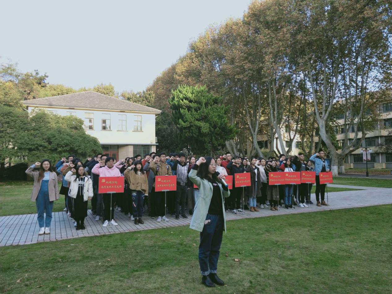 仪式第三项,国旗下全体党员宣誓。17级同学贾丽晴同志领誓,全体党员宣誓:大家右手抱拳,严肃地举起右手过肩。“我志愿加入中国共产党,拥护党的纲领,遵守党的章程,履行党员义务,执行党的决定,严守党的纪律,保守党的秘密,对党忠诚,积极工作,为共产主义奋斗终身,随时准备为党和人民牺牲一切,永不叛党”!誓词铿锵有力、鼓舞人心,大家对祖国的热爱、对共产党的敬仰更进一分,誓将为共产主义建设奋斗终身。