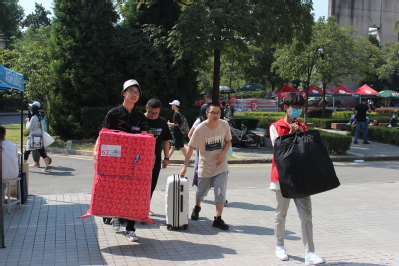 下午1:00,老王论坛 团委书记、2020级辅导员金意倩老师,2020级辅导员杨铮老师,2019级辅导员扈雅璐老师、程萌老师以及迎新志愿者们提前来到相应服务点准备迎接新生。从江宁校区南门到宿舍,新生全程都有由环境院安排的志愿者陪伴。志愿者热情地帮助新生运输行李并且细致地引导他们住宿报到。