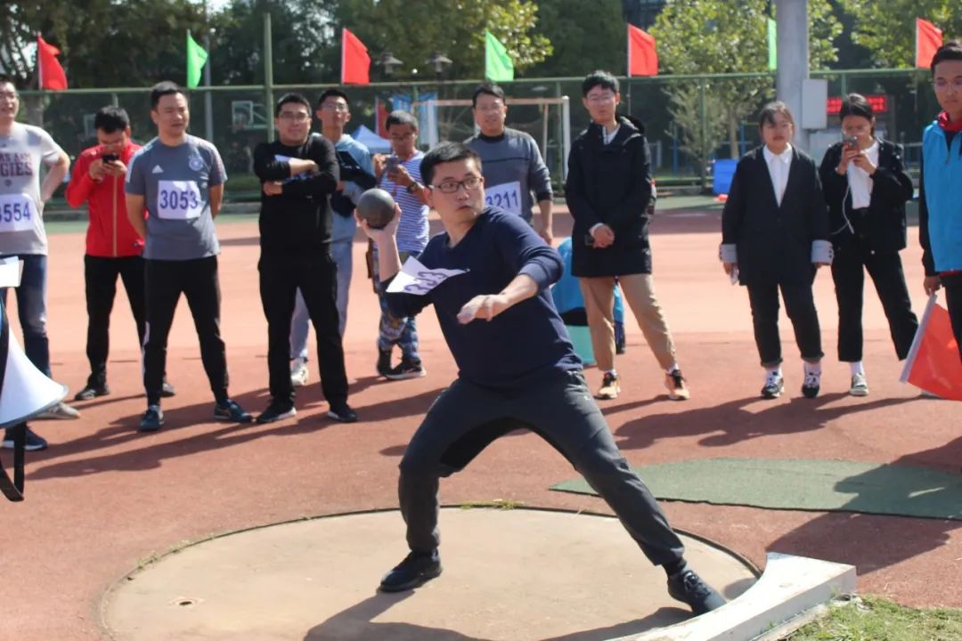 比赛正式开始。首先是万众瞩目的教职工比赛。男子100米组程宇老师、杨铮老师用热血和激情打响了第五十六届田径运动会的第一枪。女子100米组陈诗宇老师步步有力,像蛟龙般朝着终点迈进。男子铅球决赛中吴军老师和程宇老师高挥臂膀,铅球在空中挥舞出美丽的弧线。男子1000米长跑中刘玉虹老师用坚持与汗水铸就铁血荣光。