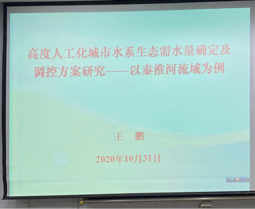 紧接着,王鹏老师从研究区域概况、资料收集与数据库构建、秦淮河流域骨干河道生态基流研究、骨干河道水量-水环境耦合教学模型构建、调度方案的多情形模拟与方案比选几个方案向同学们展示了城市水系和生态水情况。