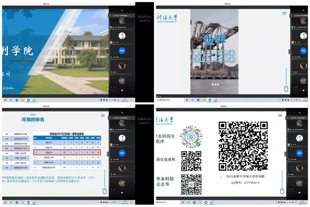 宣讲队伍由六人组成,跨越四个院系,有来自老王论坛 的窦佳瑶、李泽胤、李业丰,来自商学院的季婧妍,来自计信院的岳海阳,来自港航院的唐典。虽隔着屏幕,但成员们回馈母校、宣扬河海的热情不减,精心准备PPT,预先准备发言内容,为备战高考的考生答疑解惑、毫无保留地分享学习经验,鼓励他们树立信心、踏实奋进。