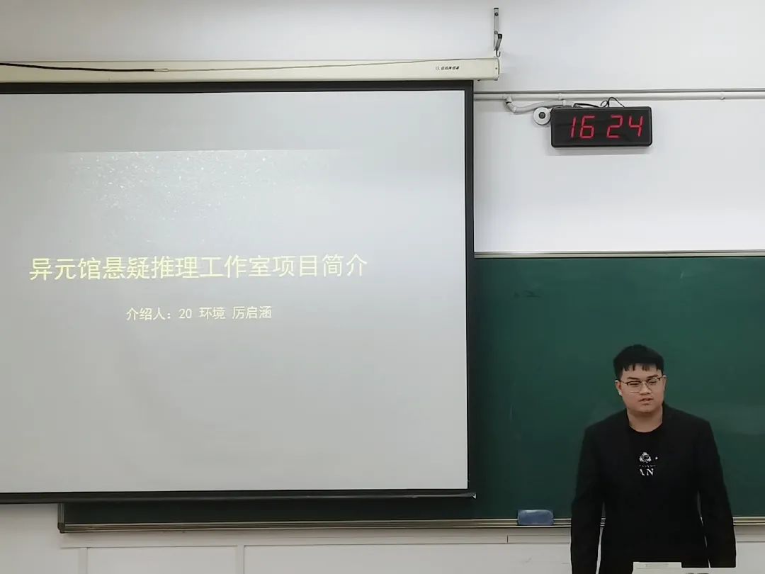 他利用PPT对计划创建的“异元馆悬疑推理工作室项目”进行了详细介绍,并从创始人简介、项目背景、项目简介、项目计划以及长远目标五个方面对项目进行了展开分析。在介绍过程中,他引用大量现有的推理方面的成就以及小组之间的讨论成果展示,向评委和观众展示了项目成员的理论基础以及知识储备,更加有说服力地展现了项目的可行性。