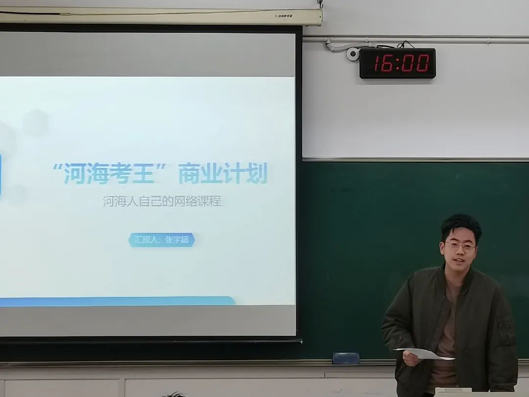 他利用PPT对所要展示的“‘河海考王’商业计划——河海人自己的网络课程”进行了详细介绍,并从项目简介、市场分析、营销策略、财务预算与风险规避五个方面对项目进行了展开分析,同时对本项目与当前市场上现有的网络课程平台进行了对比,并强调了本项目的优势与针对性。在展示过程中,他对实施过程中可能遇到的问题进行了分析,并提出了解决方案,进一步展现了项目的完备性。