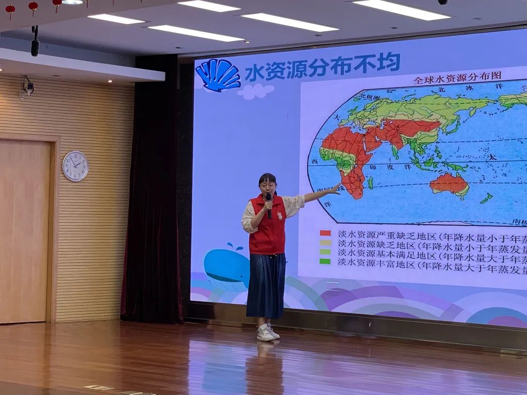 下一个讲解的部分“我们生活在一个缺水的地球”,志愿者们通过对比世界水资源总量,淡水资源总量和可利用淡水资源总量的数据更直观的让孩子们了解到节水的重要性,接下来志愿者们又通过看视频,提问题等方式让小朋友们发散思维,与生活中所见所闻相联系,更加深刻的认识到我们所生活的地球水资源经不起挥霍。
