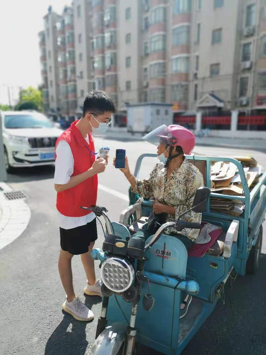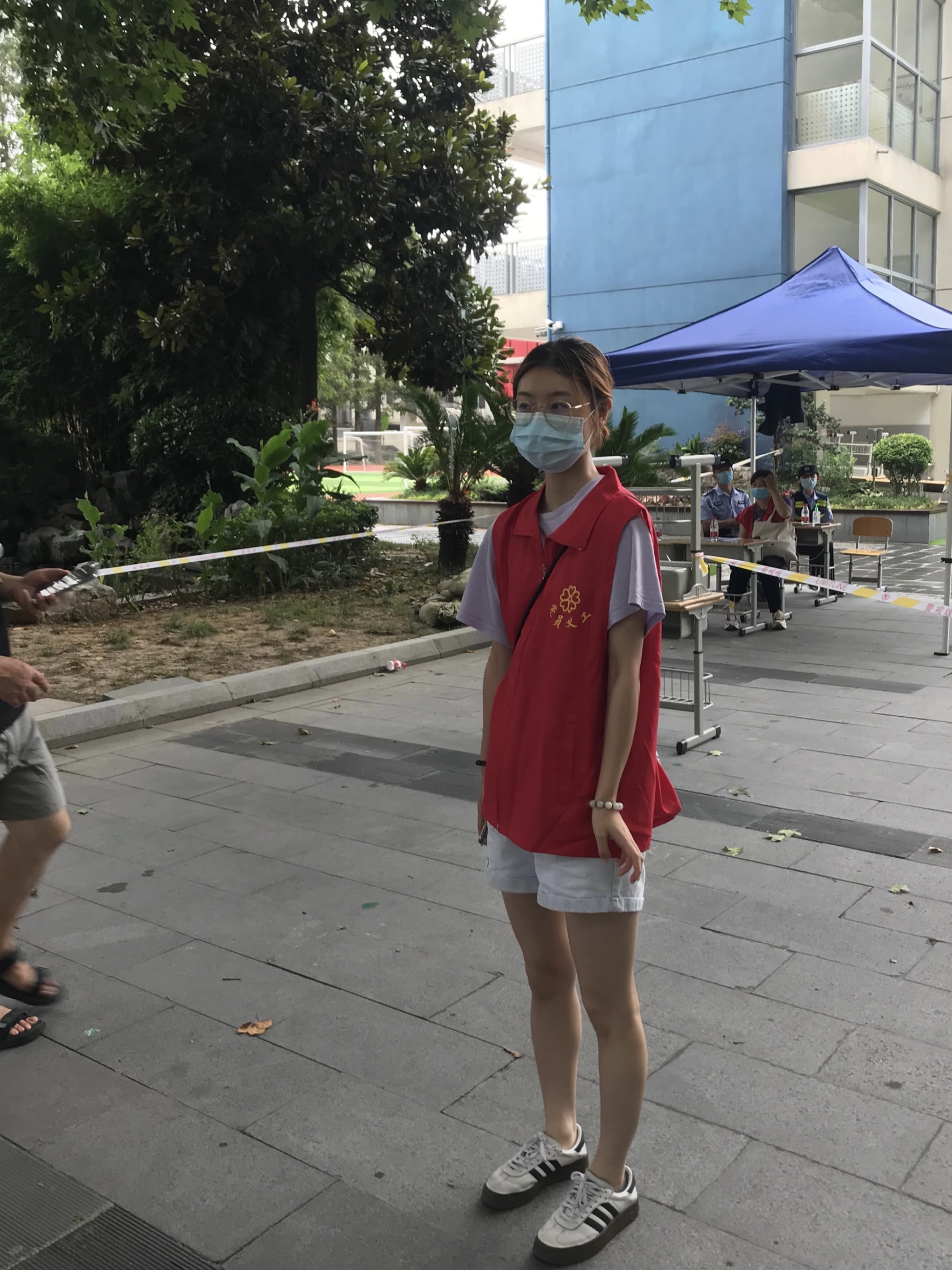 2020级本科生张雨桐、黄少刚、钱悦琦等同学积极响应当地共青团号召,作为志愿者加入所居住社区的疫情防控工作中,负责在街道检查进出人员健康码并测量体温等工作任务。