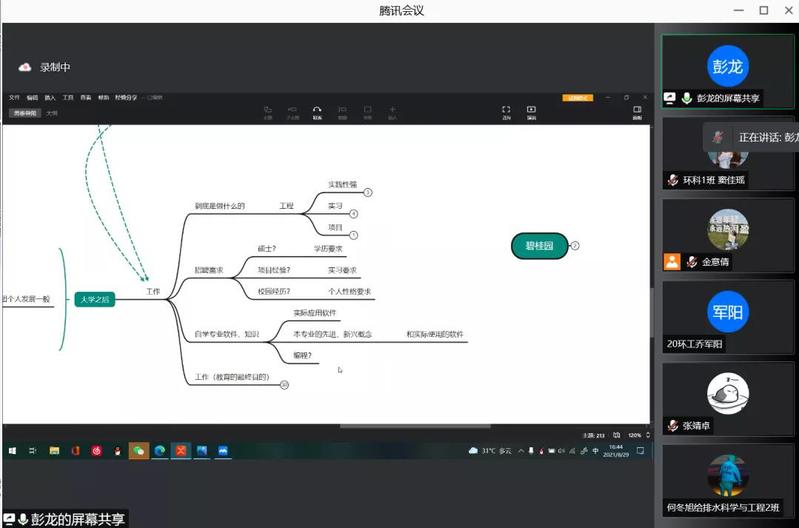 彭龙以思维导图的形式分享了大学四年的阶段分别需要做什么,他指出接受教育的目的都是为了工作,并将工作分为科研与具体工作,提醒同学们提前做好规划,在大一结束后做好抉择,抓住当下,从现在开始努力。