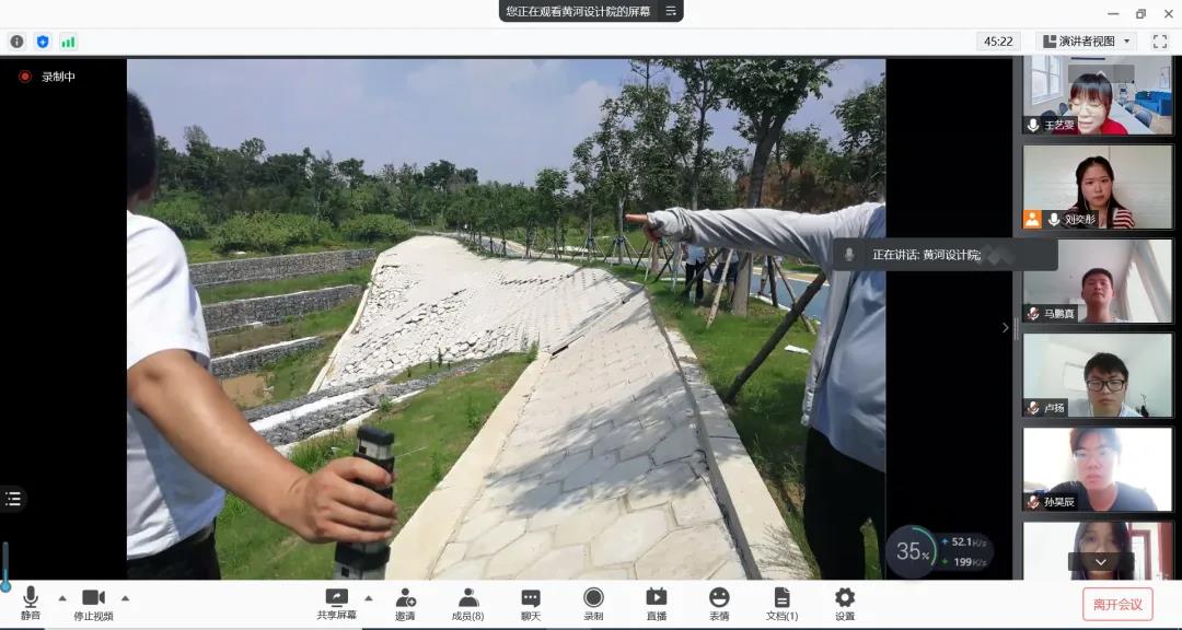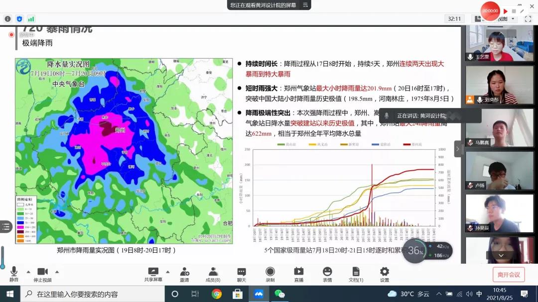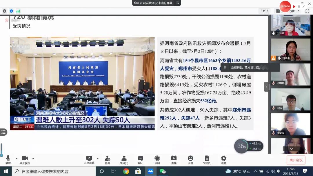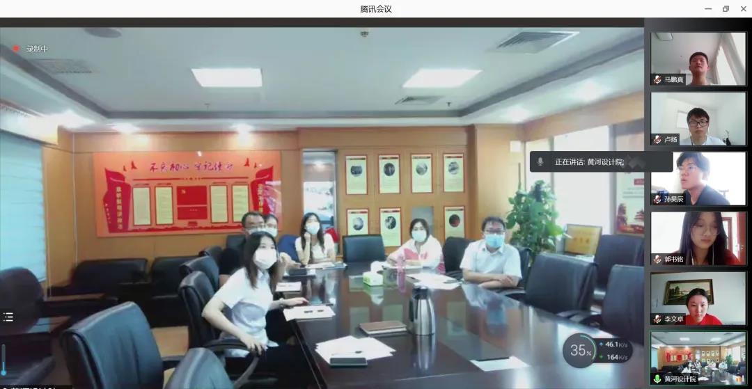 8月25日上午十点半,实践团连线黄河设计院,并与黄河设计院生态院团委书记赵地,生产经营管理部副主任刘信勇,生产经营管理部黄倩影,生态环境所鲍珊珊、张超,景观文化所曹平伟、张方方共同召开了腾讯会议。在会议上,实践团成员了解到黄河设计院在此次暴雨洪灾中积极应对,并在灾后及时总结问题所在。同时,实践团成员获悉,郑州地处淮河流域,本次郑州暴雨洪灾其实对黄河影响较小,并不会如群众所担心的,导致黄河发生大洪水。相比之下,像贾鲁河等淮河支流面临的压力更大。因此,做好群众科普,避免群众因谣言而导致恐慌是非常有必要的。