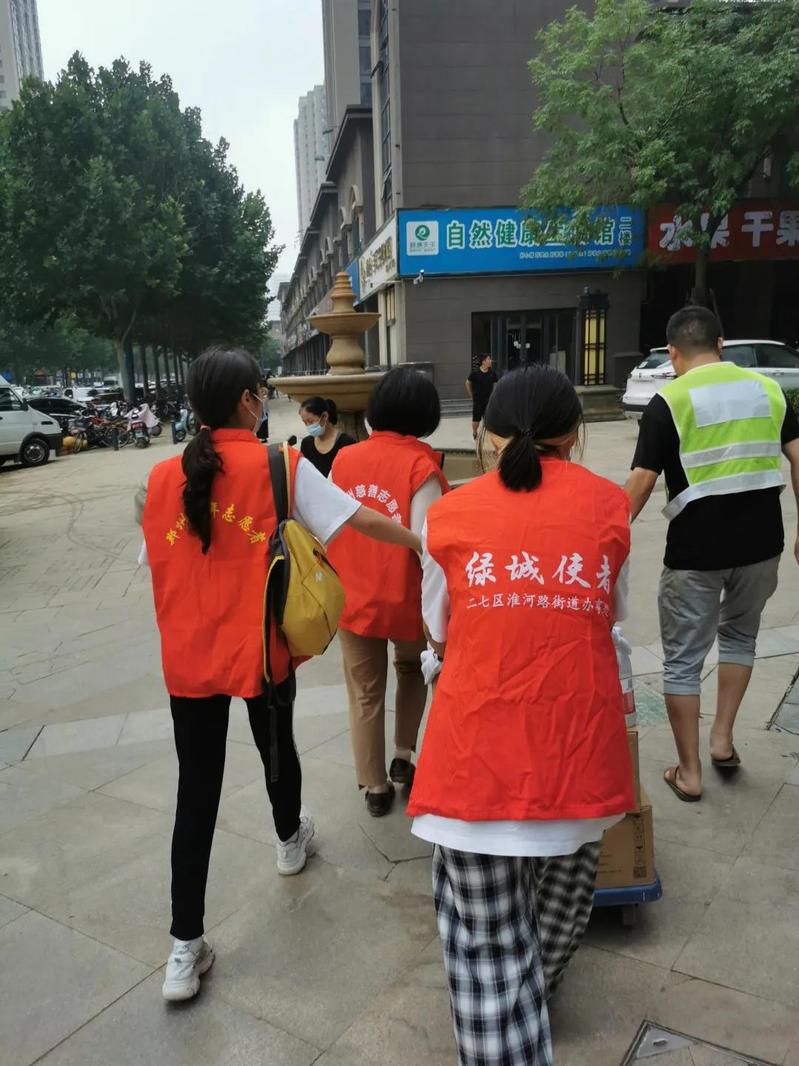 7月23日上午8点至11点,在二七区团委的动员组织下,实践团成员和其他返乡大学生、社会爱心人士等一道前往区人民政府进行搬卸捐赠物资工作。近三十余名志愿者和工作人员搭起搬卸接力人桥,将湖北省爱心企业捐赠的馒头等整车救灾物资搬卸、堆放完成。当天下午3点至7点,以返乡大学生为主的近50余名青年志愿者在淮河路街道办事处集合完毕,组成近十个小组,对接各个社区的便民服务中心进行志愿服务活动。