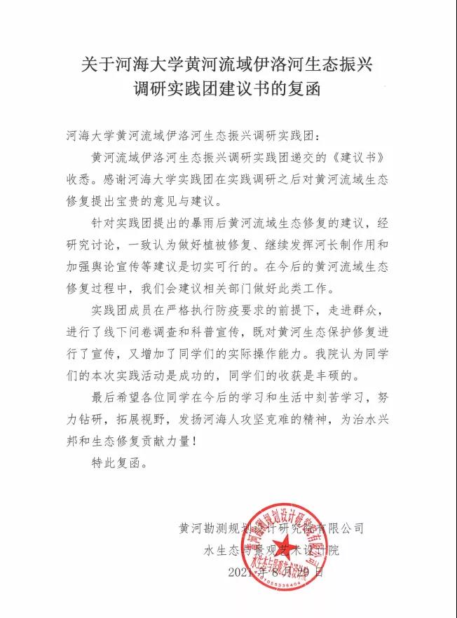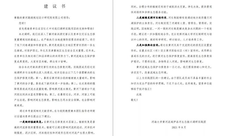 为期两天的问卷发放与科普宣传,实践团共收集到线上、线下问卷共近400份。实践团成员认真整理和汇总了问卷数据,并结合与群众深入交流的内容,向黄河设计院提交了一份建议书,阐述了群众对黄河流域生态修复重建的愿景,并代群众向一直以来为黄河流域生态建设不懈努力的黄河设计院工作人员表达了衷心的感谢。黄河设计院相关工作人员在收到建议书后给予回信,也对实践团成员表达了真挚的谢意与殷切的期盼。