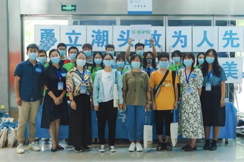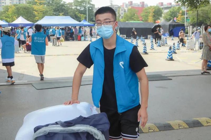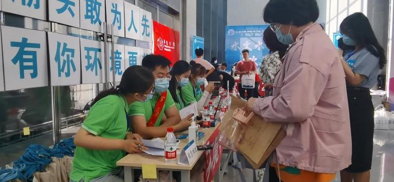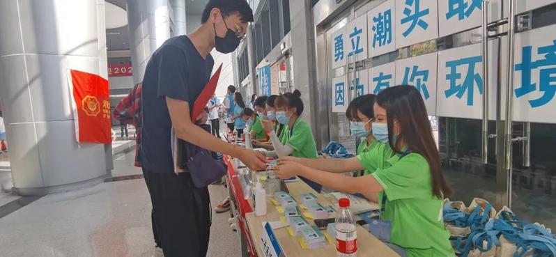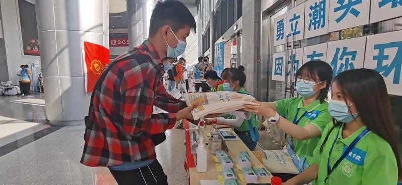 环境院的志愿者们在南门门口开始了新生入学迎新活动。现场准备了矿泉水和各类防疫物资,志愿者们满怀一腔热情,为新生引导路线并答疑解惑。