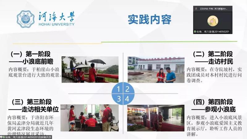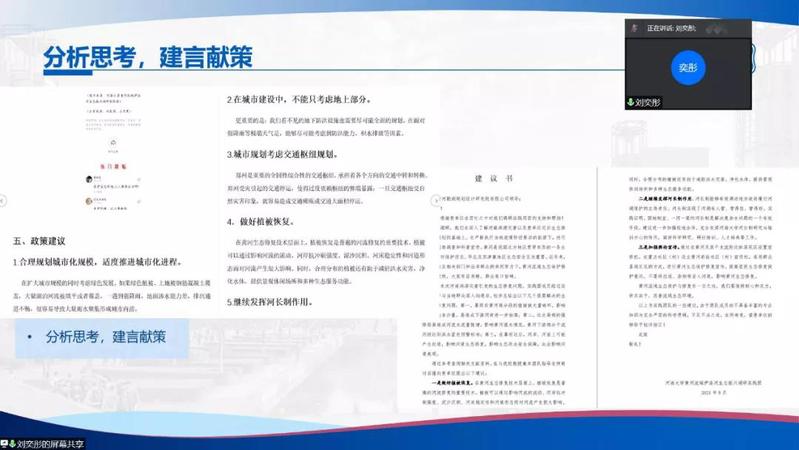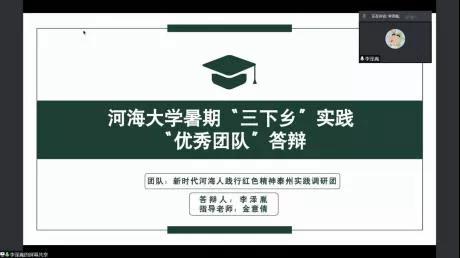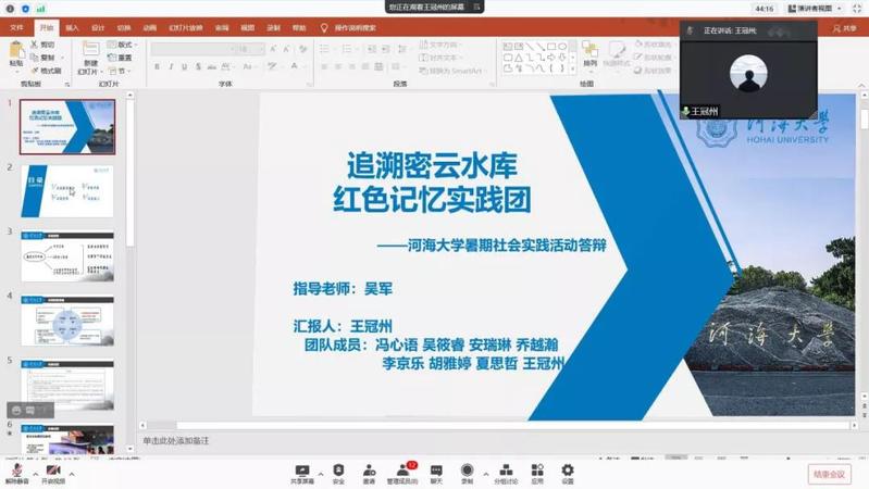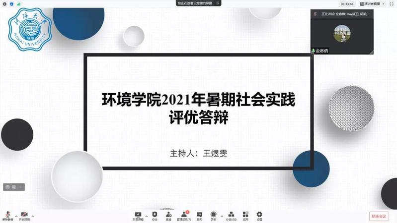 为推进落实老王论坛 暑期“三下乡”社会实践活动总结工作,2021年9月15日下午,老王论坛 举行了2021年暑期实践线上评优答辩。市政工程系胡凯老师,环境工程系王大伟老师,院团委书记兼20级辅导员金意倩老师、20级辅导员杨铮老师担任评委。疫情的特殊情况给今年的社会实践团带来了机遇和挑战。虽然大部分团队的队员都居住在不同的地方,给线下活动带来了不便,但是实践团使用了线上会议、网上问卷、就近走访等多种途径解决问题,并且顺利地完成了实践活动。线上答辩由团队借助PPT形式进行实践总结以及评委提问两个环节组成。主持人王煜雯同学简要地介绍了此次答辩的背景和评选标准后,答辩正式开始。