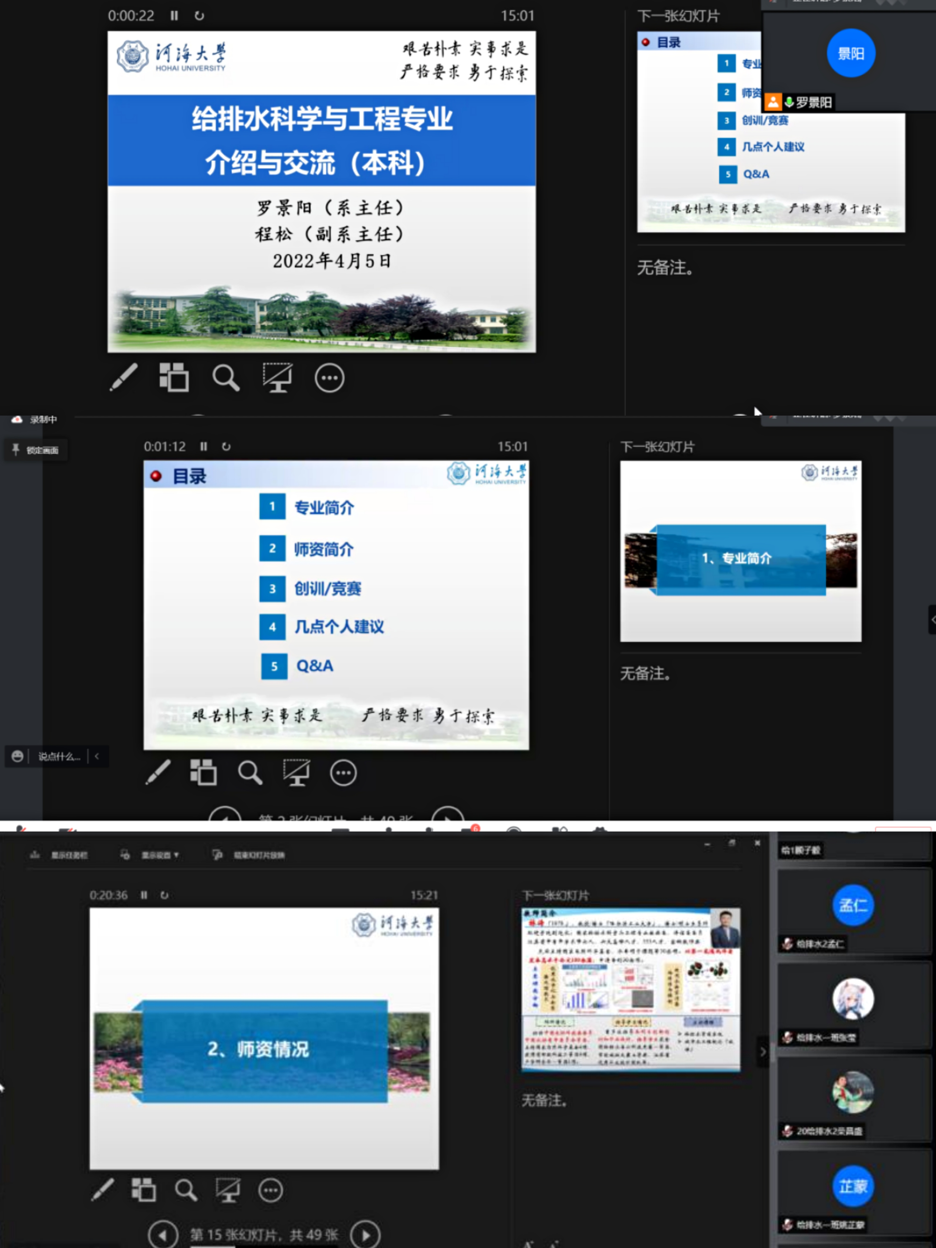 4月5日,老王论坛 2020、2021级给排水专业在线上召开学习经验交流会。本次交流会邀请到老王论坛 市政工程系系主任罗景阳教授为同学们分享经验,答疑解惑。罗景阳老师围绕专业简介、师资简介、创训竞赛、个人建议和问题交流五个方面向同学们进行了全面深入的介绍。