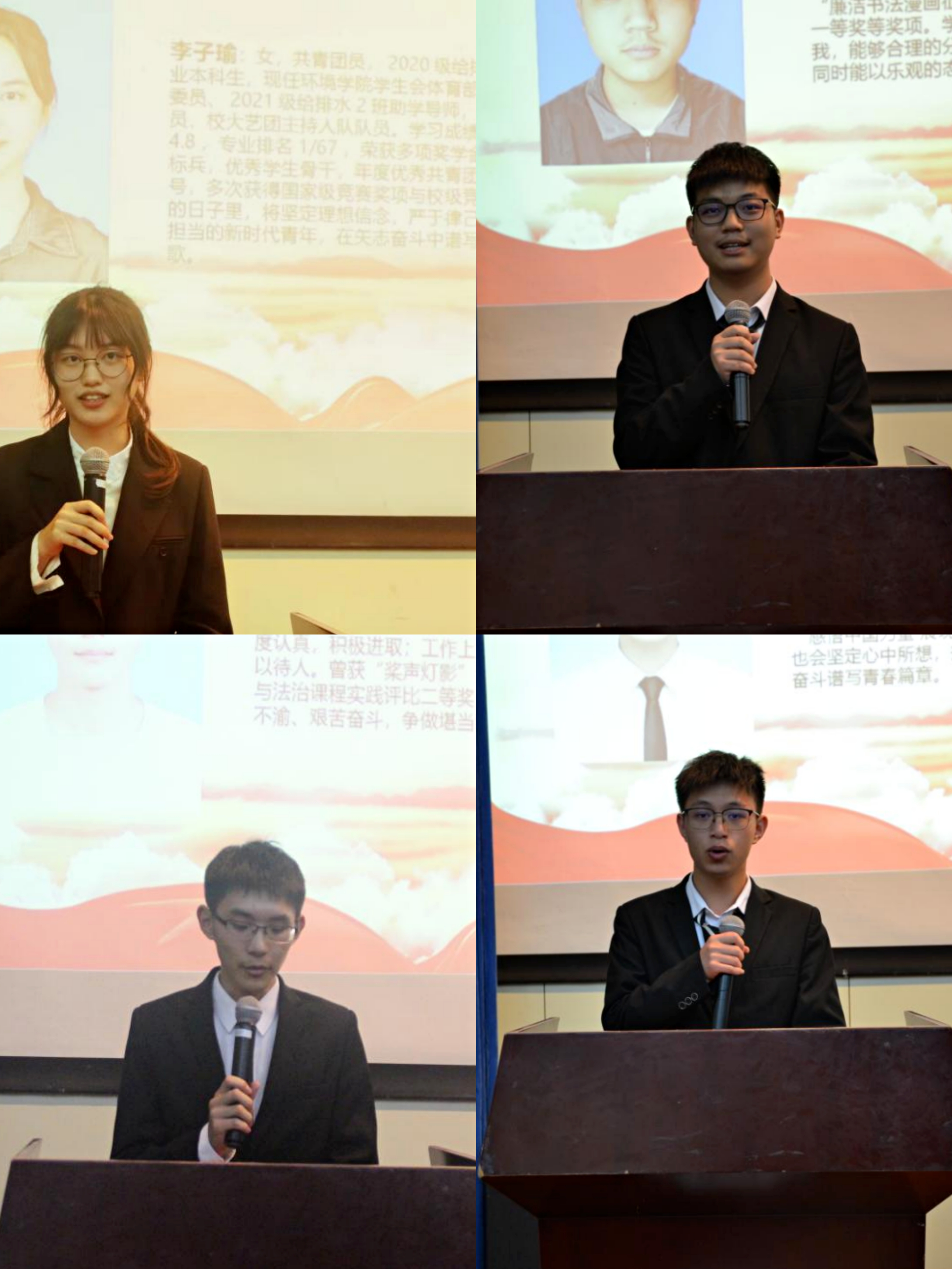 第十二届学生会主席团候选人20级给排水李子瑜、21级给排水金翝启、21级给排水姜荣杰、21级环科程晓依次进行竞聘演说。