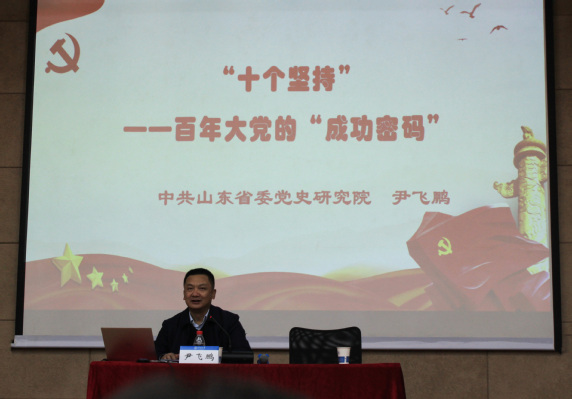 尹处长首先抛出三个问题——中国共产党为什么能,马克思主义为什么行,中国特色社会主义为什么好。之后,尹处长集中围绕这三个问题,结合中共百年辉煌党史,向同学们讲述了“十个坚持”的思想内涵。