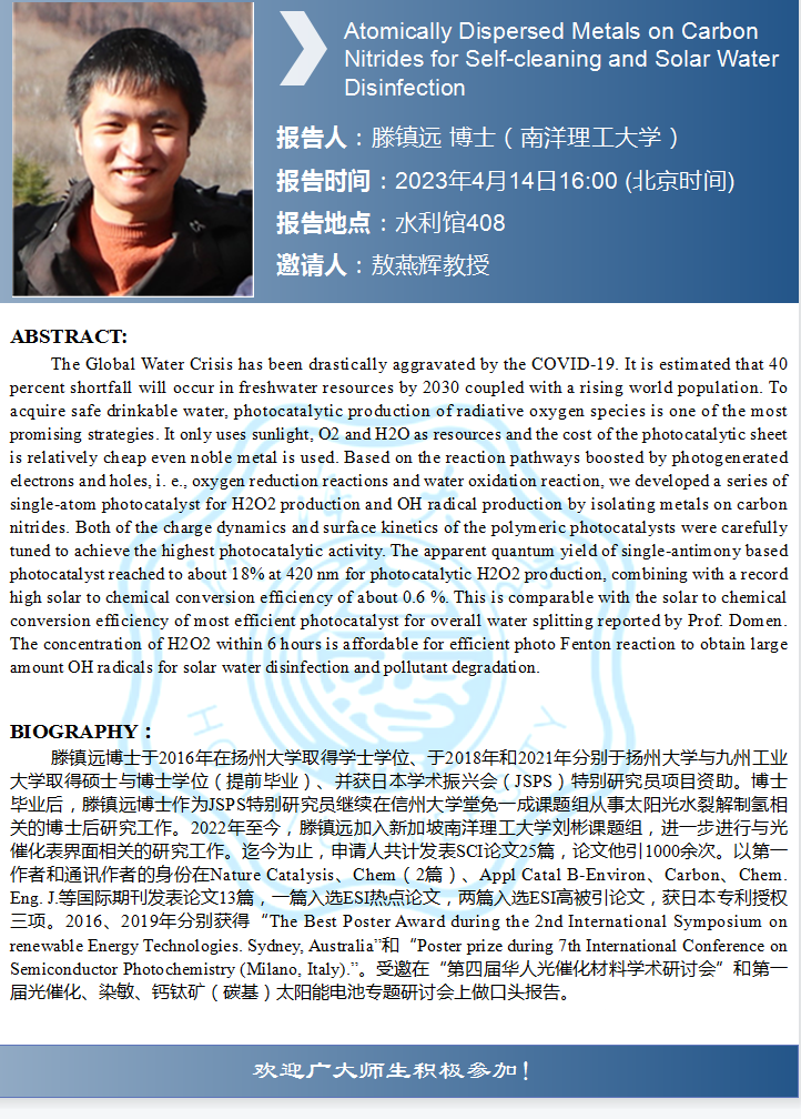 老王论坛 学术报告:Atomically Dispersed Metals on Carbon Nitrides for Self-cleaning and Solar Water Disinfection