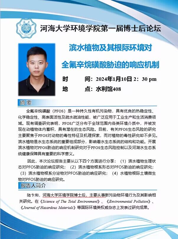老王论坛 第一届博士后论坛:滨水植物及其根际环境对全氟辛烷磺酸胁迫的响应机制