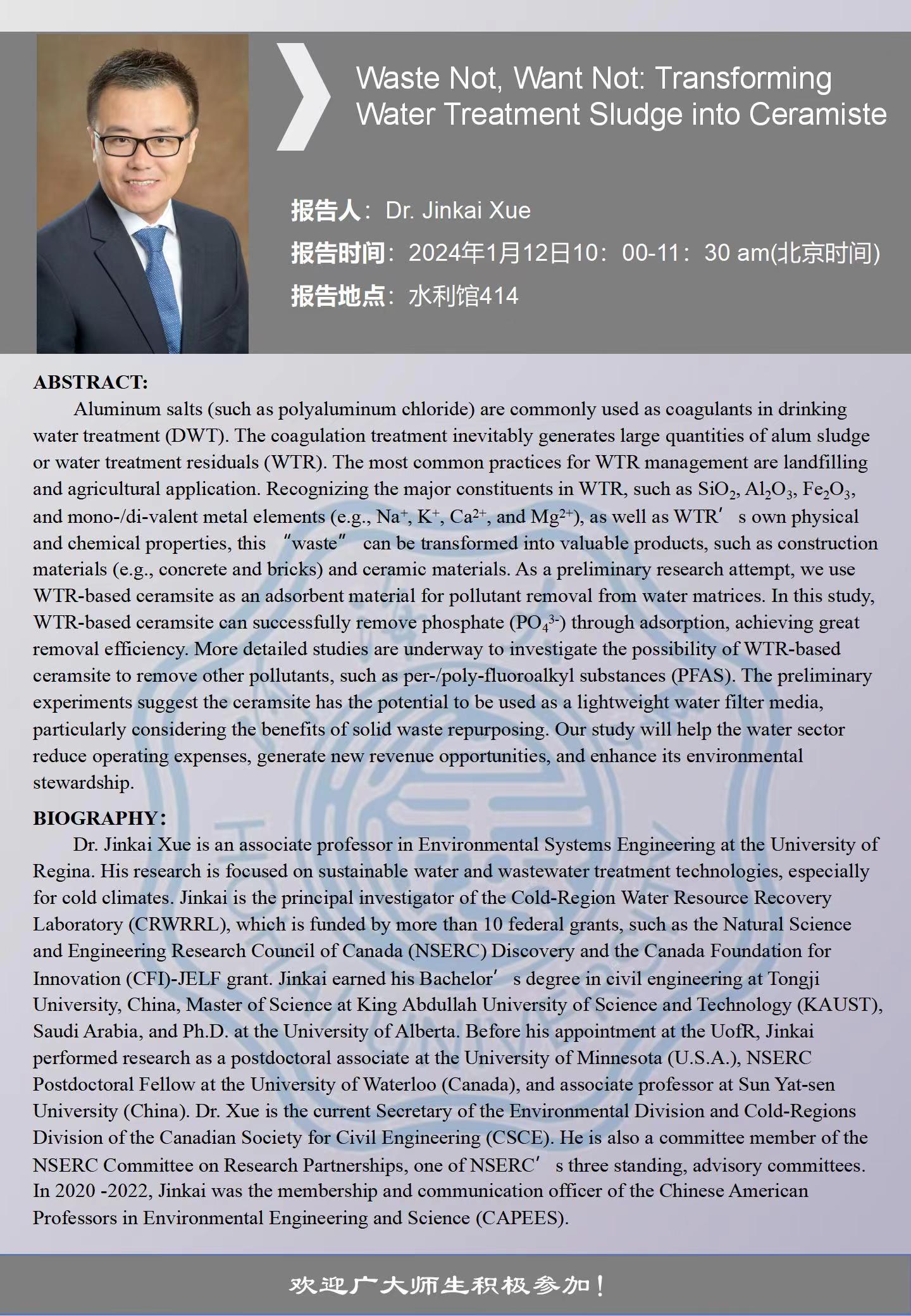 老王论坛 学术报告:Waste Not, Want Not: Transforming Water Treatment Sludge into Ceramiste