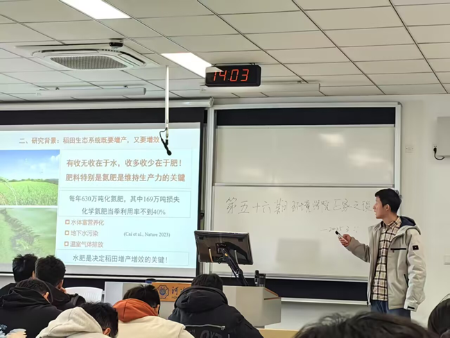 朱老师以我国水稻种植和水稻于我国的重要性切入主题,指出硝化反硝化作用研究的重要性,并提出水文-生物电化学耦合调控机制,强调调控机制所具备的优点;同时朱老师也鼓励同学们在科研工作中能竭尽所能,不断学习,不断进步。朱老师向同学们分享了自己的研究成果,又借助生动风趣的例子让同学们沉浸其中,使同学们深刻理解了水文-生物电化学耦合调控机制。